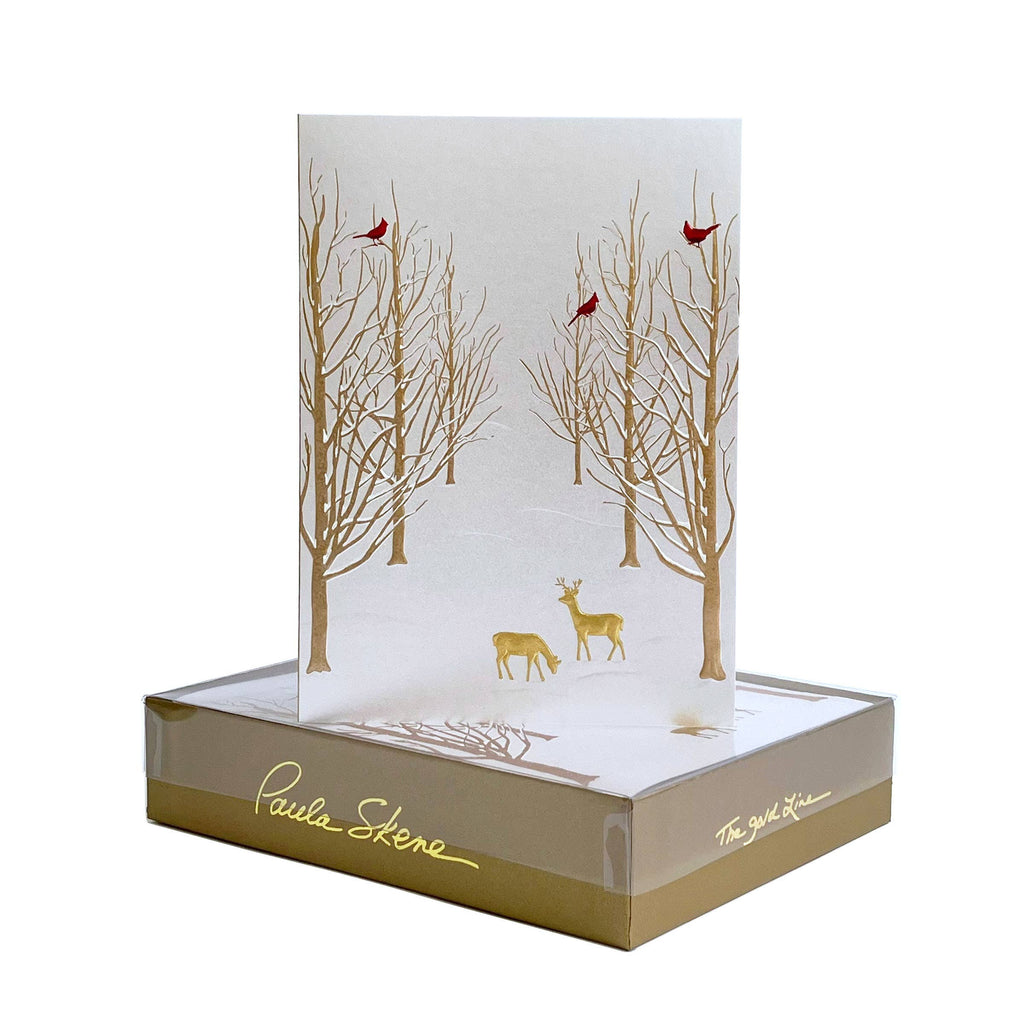 PAULA SKENE DESIGNS - Snowy Forest Gold on Silver Satin Christmas Card: Boxed Set