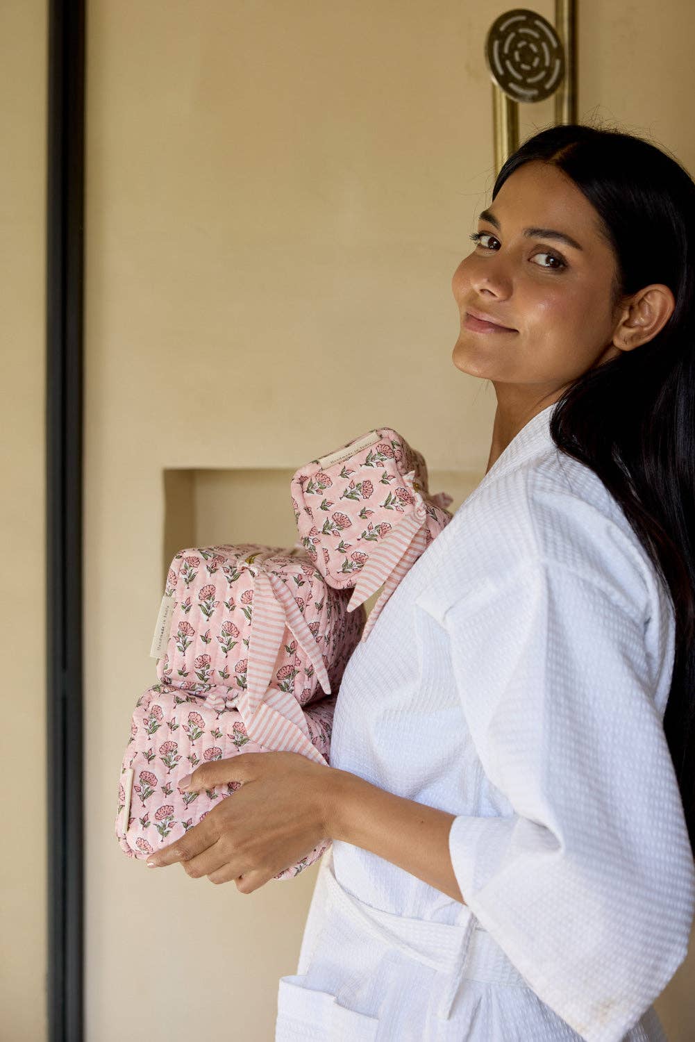 Discover the artistry of everyday essentials with this charming organic cotton toiletry bag from Paper Mirchi's On-the-Go collection. Each piece is lovingly block printed by skilled artisans and quilted to perfection, showcasing a delicate ditsy floral design in soft blush tones. The practical wipe-clean lining and four internal pockets keep your bits and bobs beautifully sorted, whether you're heading to the gym or jetting off on adventure. A geometric zip pull adds a playful finishing flourish. Handcrafted in small batches means yours is genuinely one-of-a-kind – perfect for treating yourself or gifting to someone special. Style meets substance in this little treasure.
